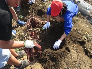 これまで育ててきたサツマイモを、たてわり班ごとに掘りました。大きく育ったサツマイモに驚きながら、楽しく掘る姿が見られました。