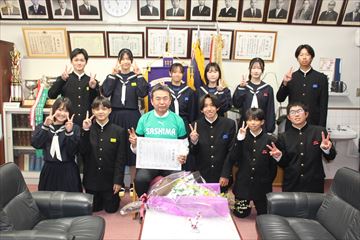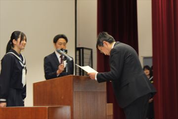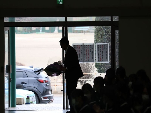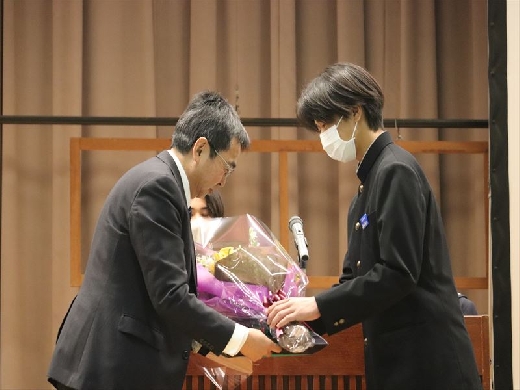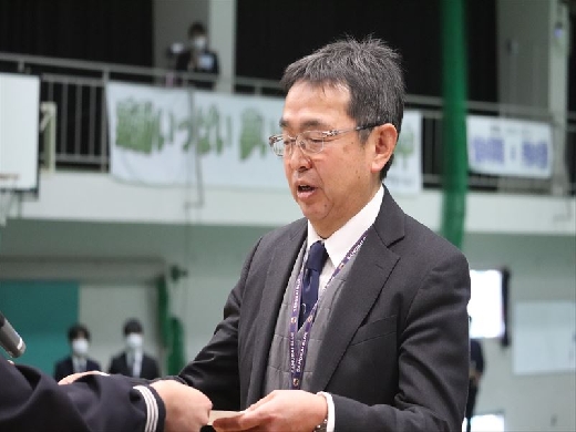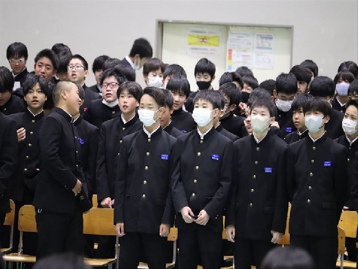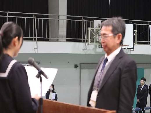 校長先生に卒業証書を渡した後、校長先生のサポーター(全校生徒・先生方)による心温まるメッセージ動画を見ました。そして、最後に全校生徒と教職員で『栄光の架橋』を歌いました。校長先生へ感謝の気持ちを込めた、最高の歌声を届けることが出来ました。