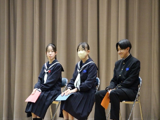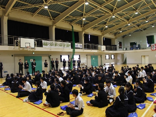 続いて、第1学期始業式が行われ、各学年の担当職員の発表などがありました。生徒は、新年度に向けて胸を躍らせながらしっかりとした態度で参加することができました。