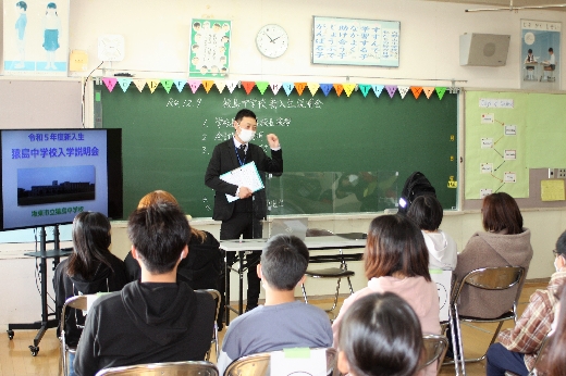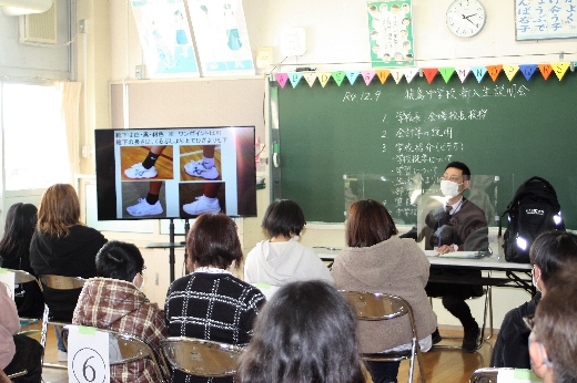 令和5年度に猿島中学校に入学する児童とその保護者の皆様への「新入生説明会」が、12月9日(金)午後、内野山小学校の英語ルームで開催されました。感染症の拡大防止のため、今年度も中学校の体育館に一堂に会しての開催ではなく、小学校区ごとに各小学校を会場としてお借りしての分散開催です。学校長のあいさつの後、会計等の説明や中学校生活の紹介などが行われました。4月の入学を心待ちにしております。