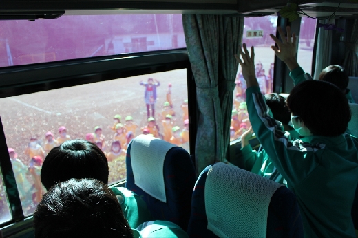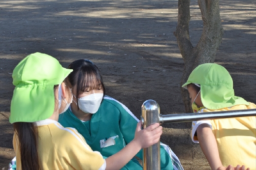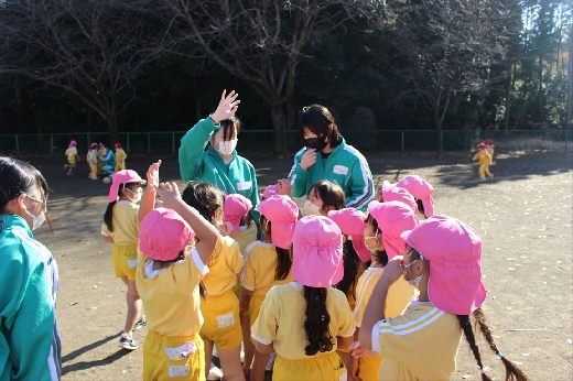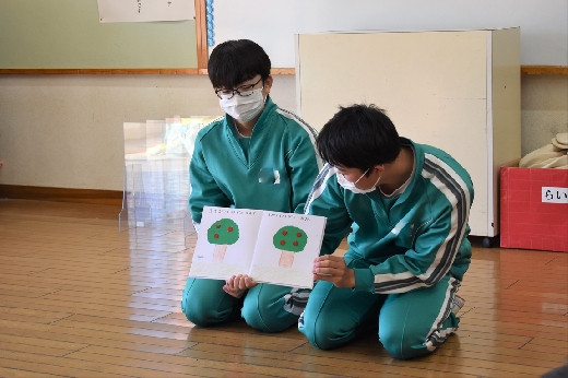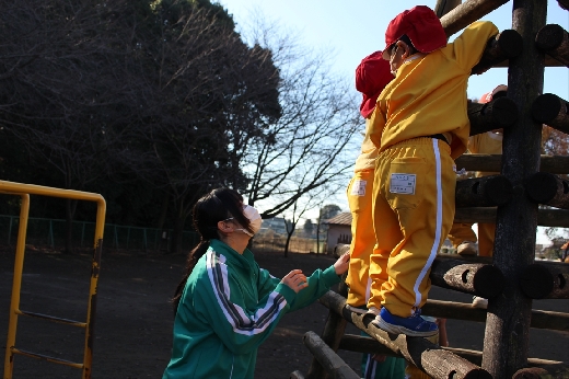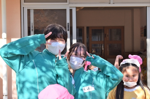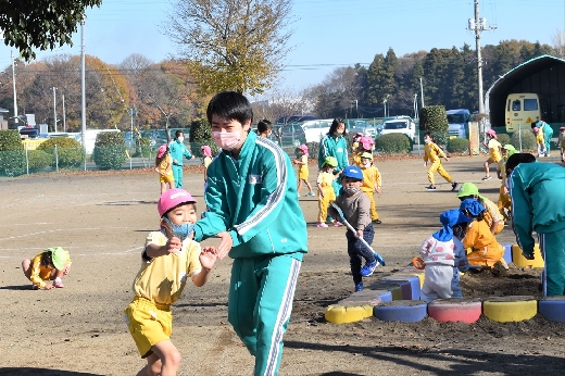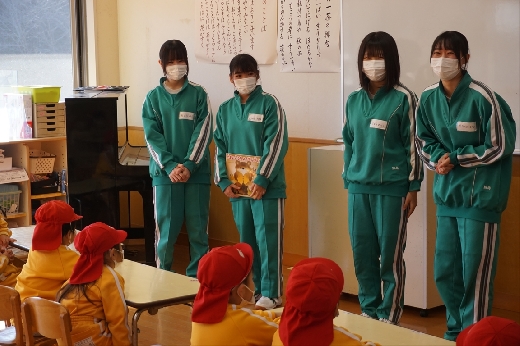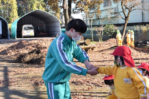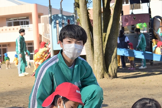 12月8日(木)午前、技術・家庭科(家庭領域)の学習の一環として、3年3組と3年4組が「若草明徳保育園」で保育実習を行いました。幼児とふれ合う実践的・体験的な学習活動を通して、幼児の心身の発達と生活、それを支える家族の役割や遊びの意義について理解し、幼児との関わり方を工夫できるようにすることが主なねらいです。朝、バス2台に分乗して中学校を出発、約2時間の実習で生徒たちは幼児たちとたくさんふれ合い、幼児についての理解を深めていました。