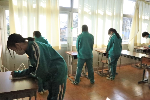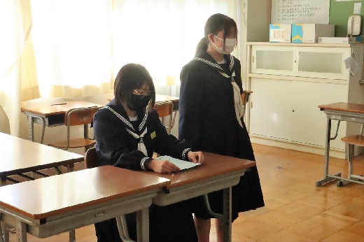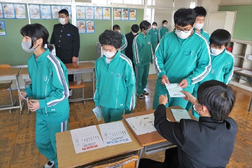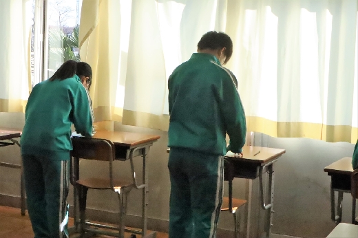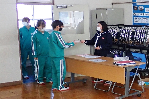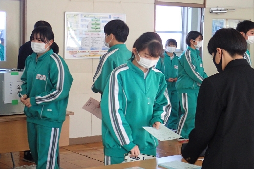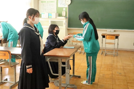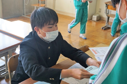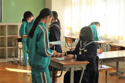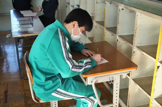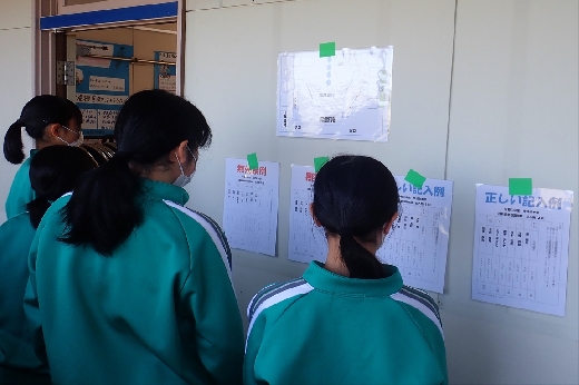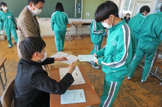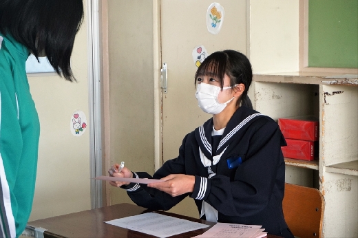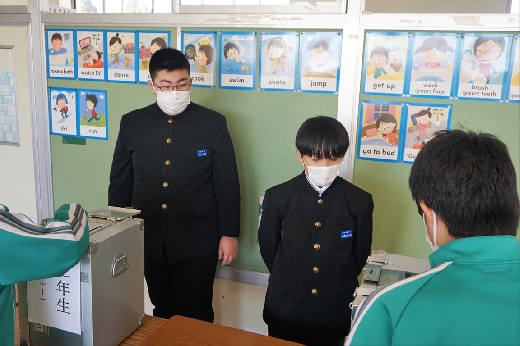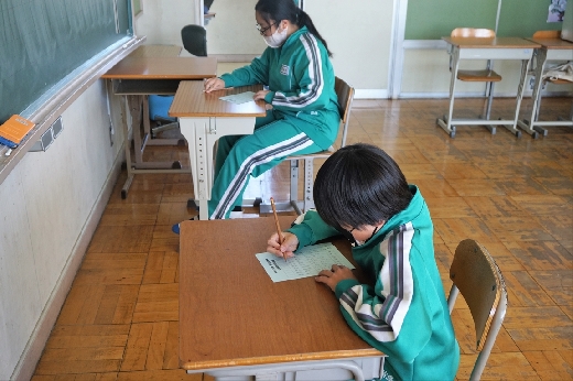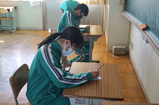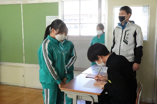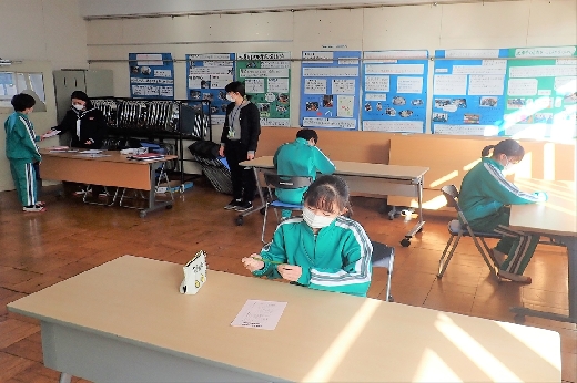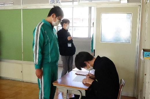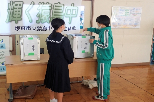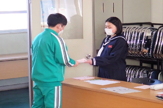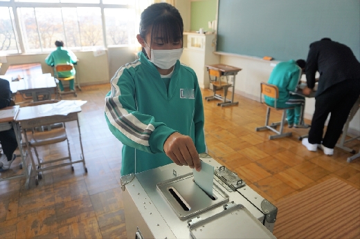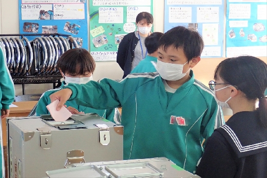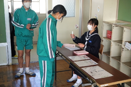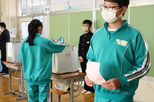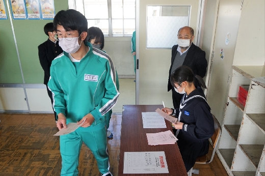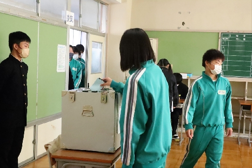 12月12日(月)5校時、生徒会役員選挙の「投票」が、学年ごとに3会場に分かれて行われました。まず、受付名簿で氏名を確認し、選挙管理委員から投票用紙をもらいます。そして、選んだ候補者名を記入し、投票箱に入れます。受付から立会人まで、すべて選挙管理委員が運営しました。生徒たちは、投票のしくみを学びながら、一票を投じていました。また、放課後、選挙管理委員会で開票作業を行いました。