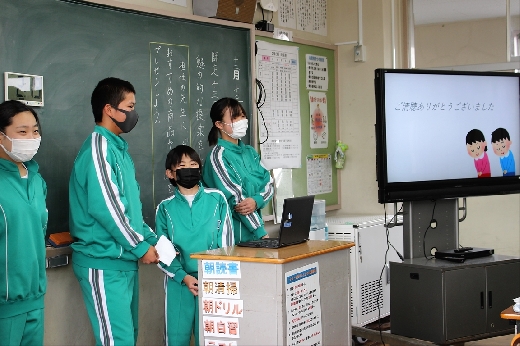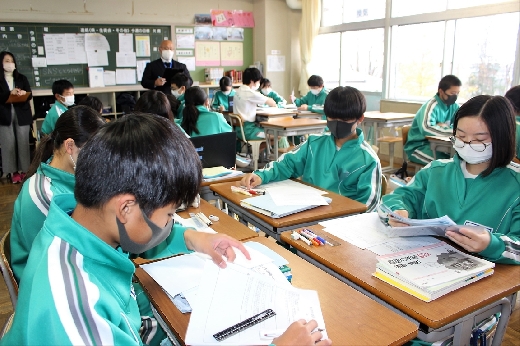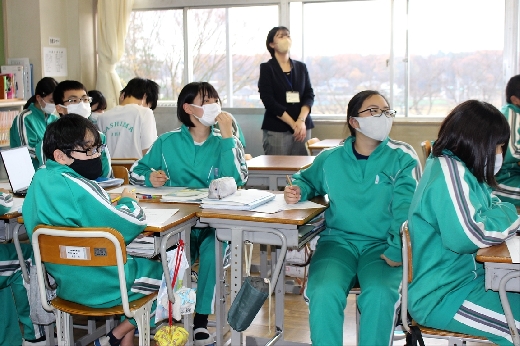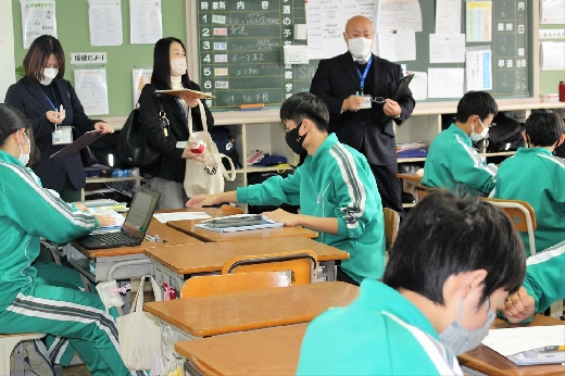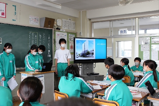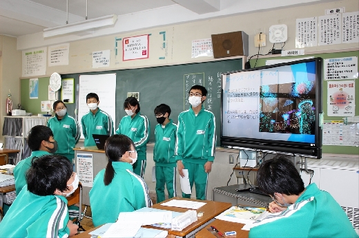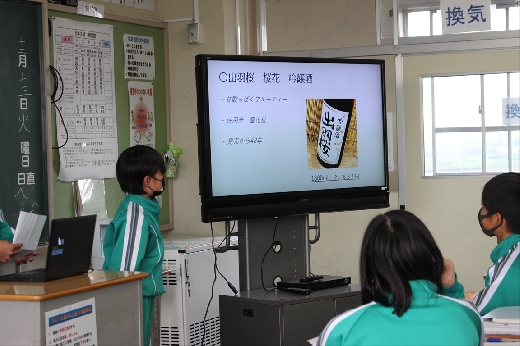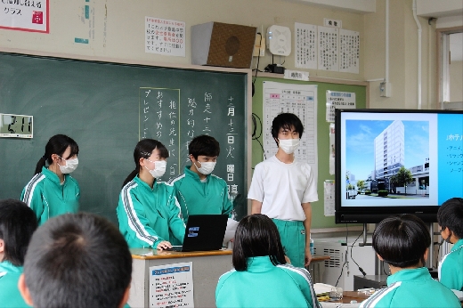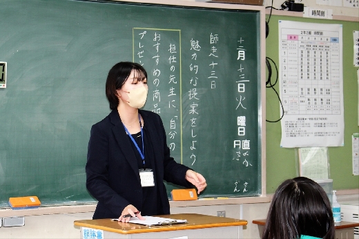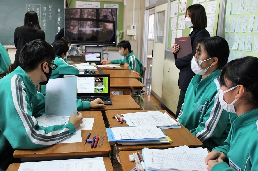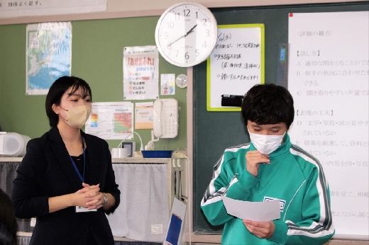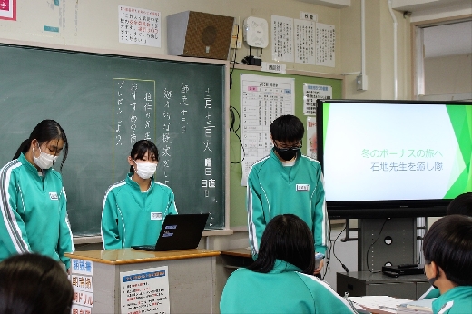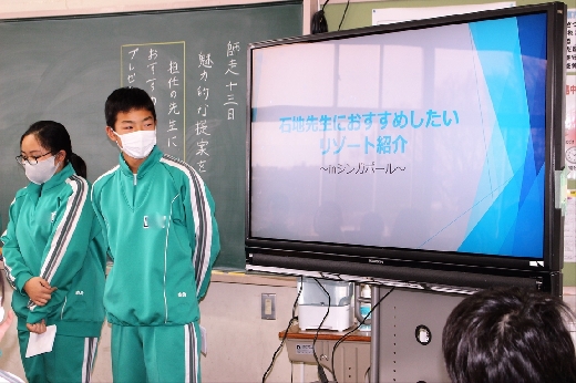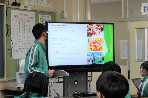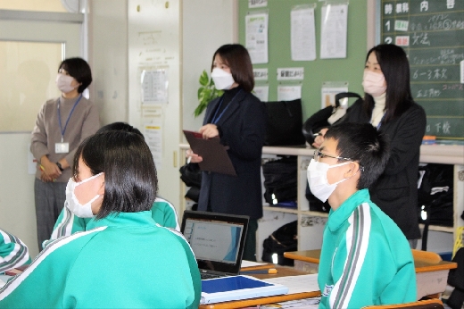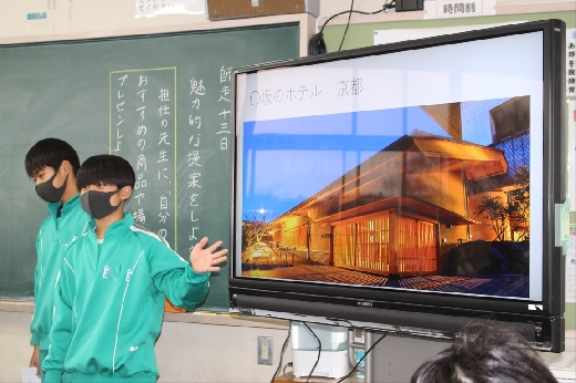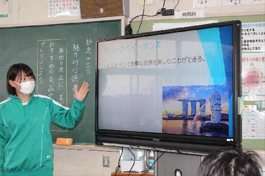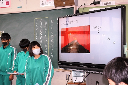12月13日(火)5校時、若手教員研修の一環として、2年2組で国語科の公開授業が行われました。「魅力的なプレゼンテーションをしよう」というテーマで、担任に対しておすすめの場所・商品のプレゼンテーションを行いました。生徒たちは、グループごとに、魅力が伝わるように資料や話し方などを工夫しながら発表に取り組んでいました。