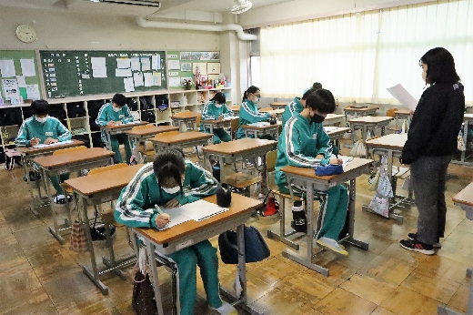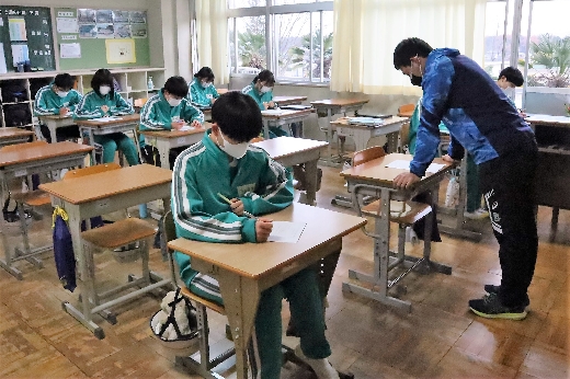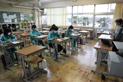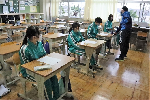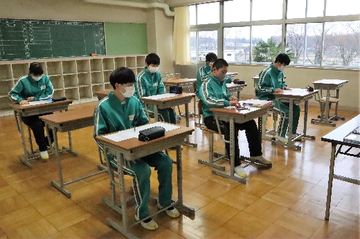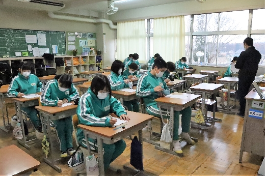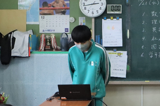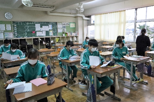 12月21日(水)6校時、3年生の学年集会がオンラインで開かれました。はじめに、2学期の学習面や生活面の振り返りをもとに、これからの学習のしかたや冬休みの過ごし方について、全員で留意点を確認しました。そして、2学期を終えるにあたり、各クラスの学級委員からあいさつがありました。生徒たちは、真剣な態度で集会に臨んでいました。その後、1月に行われる私立高校入試に向けての事前指導が、高校別に分かれて行われました。