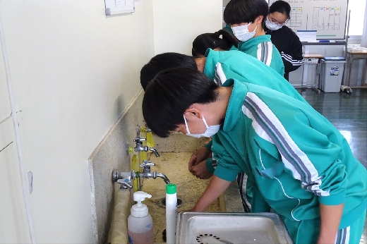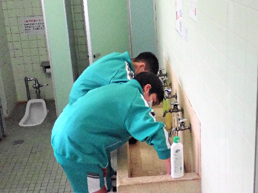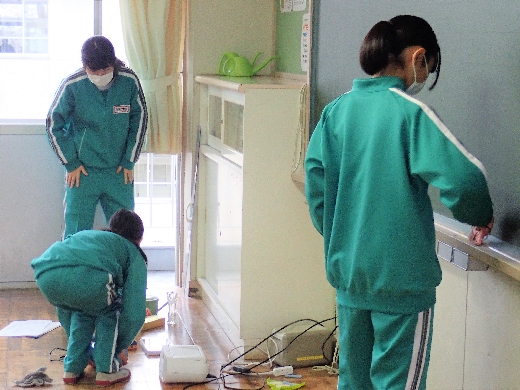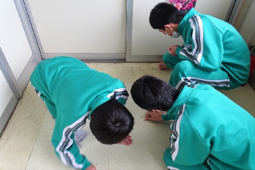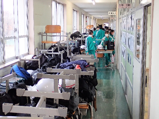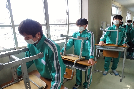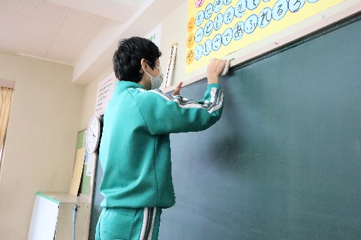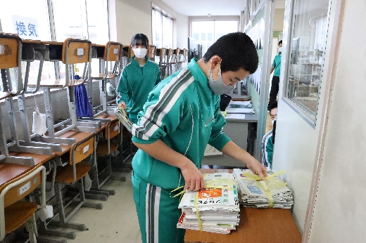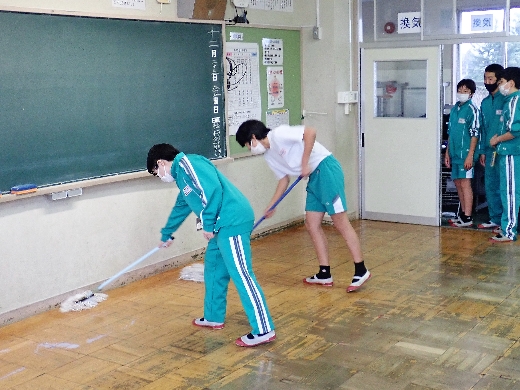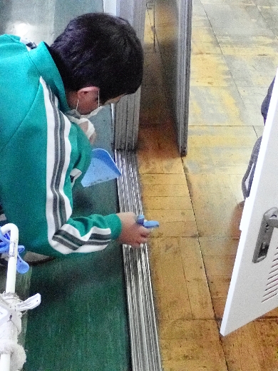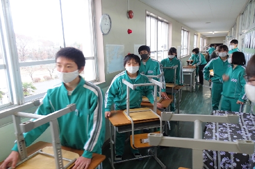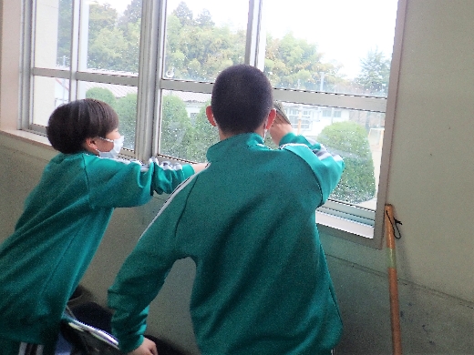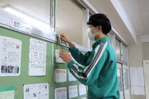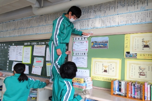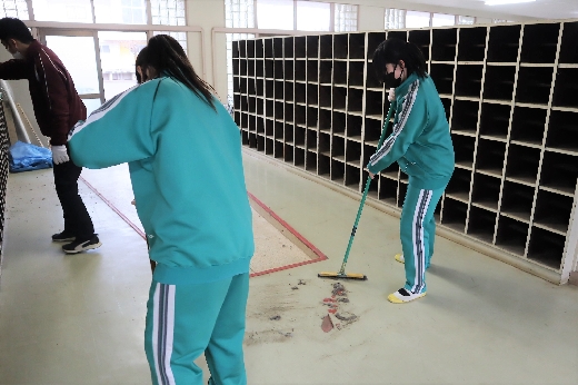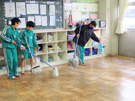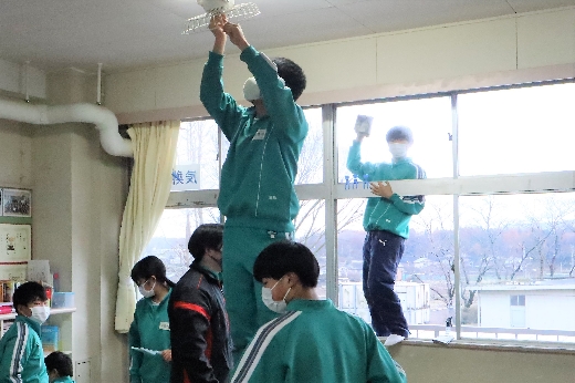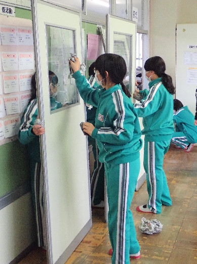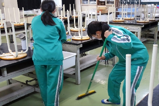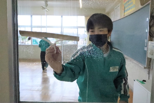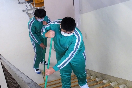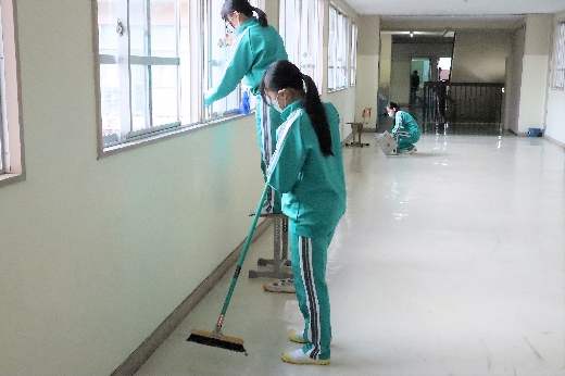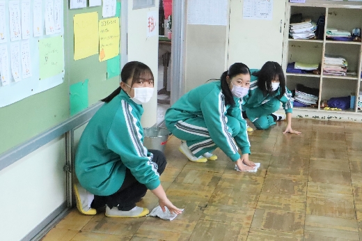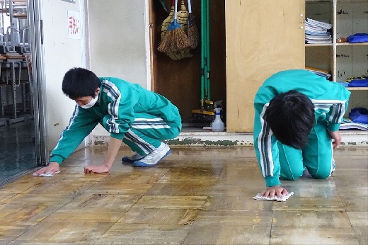 12月22日(木)午後、1年間使用した校舎に感謝の気持ちを込めて、全校一斉に大掃除を行いました。まず、各自の荷物を整理し、机・いすを廊下に出しました。そして、いつもの清掃に加えて、教室や校舎の隅々、高いところや窓など普段できないところもきれいにしました。最後に、教室の床にワックスをかけて仕上げました。生徒たちは、清掃のしかたを工夫しながら意欲的に取り組んでいました。