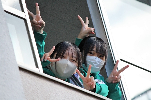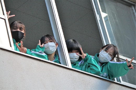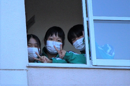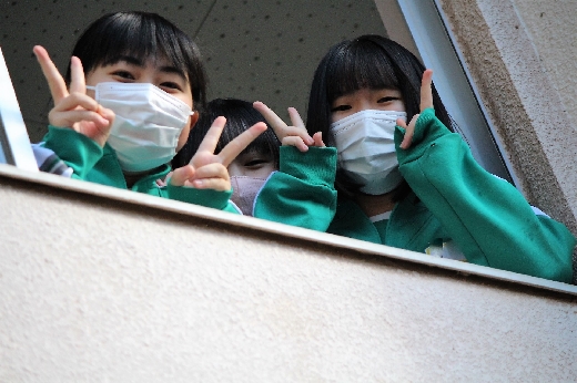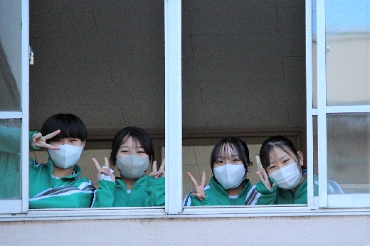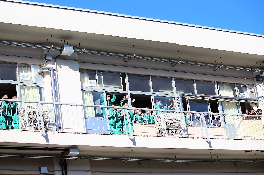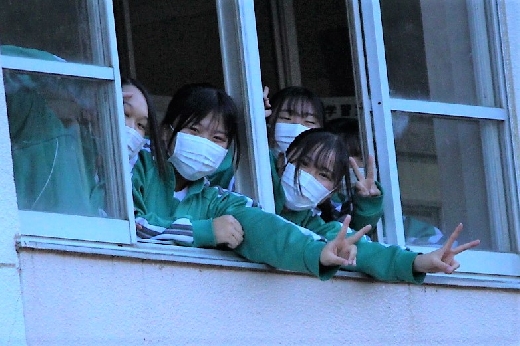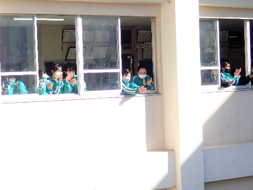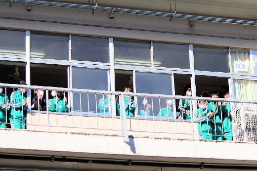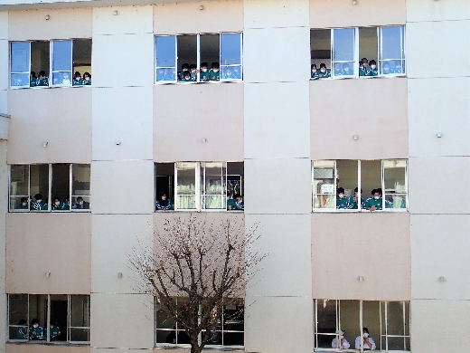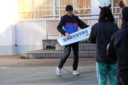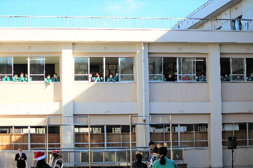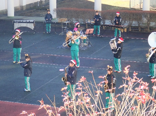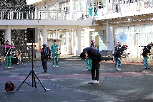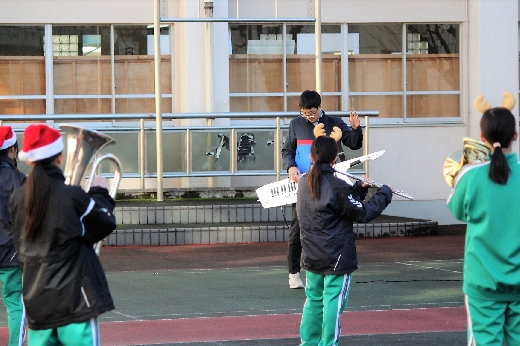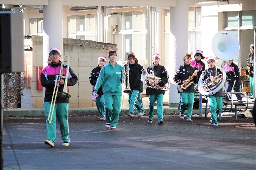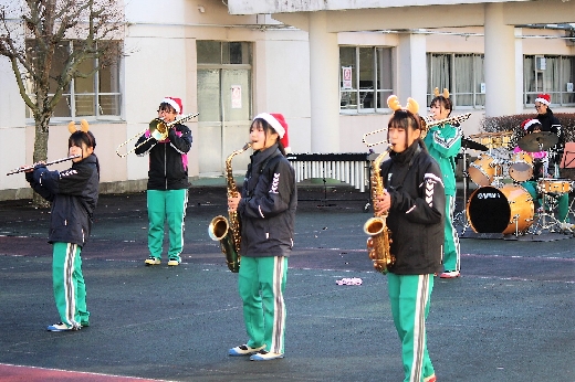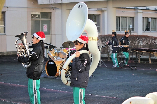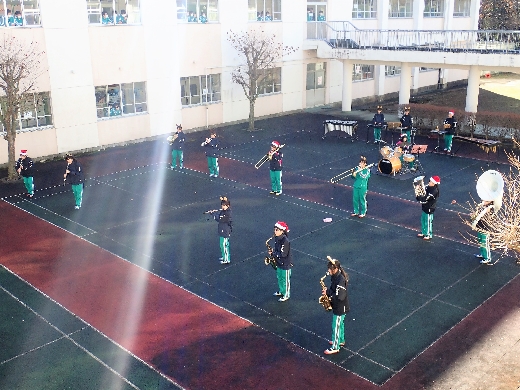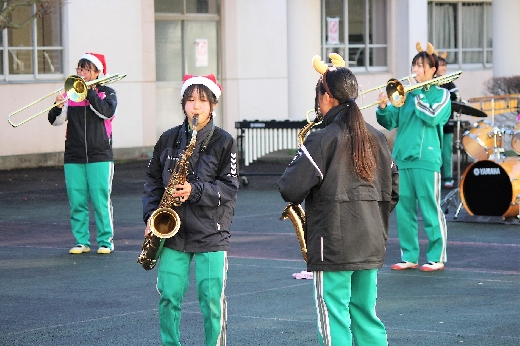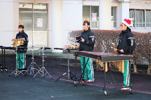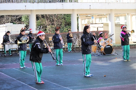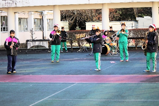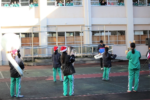 12月23日(金)昼休みに、中庭で吹奏楽部が「サプライズ演奏会」を開いてくれました。1~3年の吹奏楽部員16名が昼休み、突然中庭に登場し、演奏会が始まりました。全校生徒が2階・3階の廊下や教室から見守る中、「学園天国」「ミックスナッツ」の2曲を披露してくれました。2学期のしめくくりに全校生徒の心が温まるひとときとなりました。