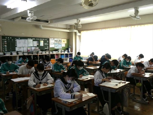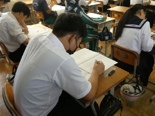 始まりの合図が鳴ると、真剣に問題に取り組む3年生の姿がありました。