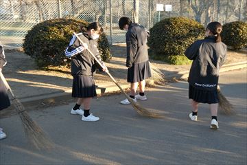 1年生の各クラスごとに、あいさつ運動と落ち葉掃きが行われました。