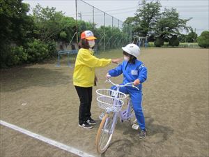 最後に、子供たちによる乗り方練習を行いました。校庭に描かれたコースを、自転車で順番に運転しました。