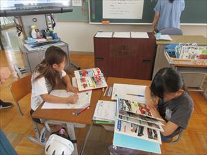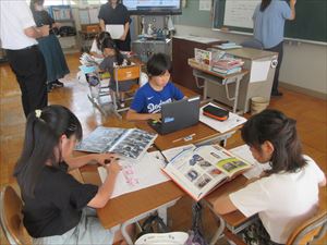 3年生の社会では、自分で調べ、資料から分かったことをプリントにまとめていました。3年生は、自分の課題に向かって真剣に取り組んでいて、とても素晴らしかったです。自分で課題をつくって、必要な資料を自分で選ぶことができて、主体的な学びに向けた良い取り組みです。