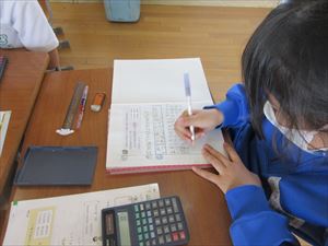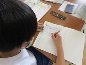 授業の後半は、どうやって求めればよいかをノートに言葉でまとめていました。頭で考えて計算したことを文章で書き表すことは、まだ自信が持てないようですが、相手に伝わるような文章を書けるようになってきました。成長を感じました。