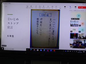 10月1日(水)の昼休みに、猿島中学校区の小中学校がオンラインで交流する「いじめストップ!絆づくりプロジェクト」を実施しました。各小中学校がそれぞれの特色ある学校行事を順番に発表をし合いました。その中でもいじめやからかいをなくすための活動や取り組みを紹介し、互いの学校の良さを再確認することができました。本校6年生も学校代表として、立派な態度で発表することができました。また、SNSで起きやすいトラブルについても考え、有意義な時間となりました。
