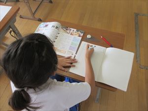 話合いでは、校内にある防災シャッターや非常口、救助袋などに気づいて、子どもたちは発表していました。また避難訓練の実施のほか、放送室の張り紙という発表もありました。子どもたちは校内にあるものをよく見ているのですね。感心します。
