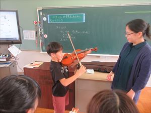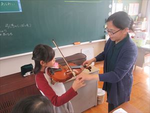 授業の後半では、子どもたちはバイオリンの音色を十分味わいながら聴いていました。授業のねらい達成ですね!