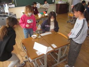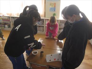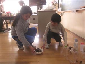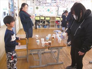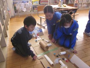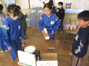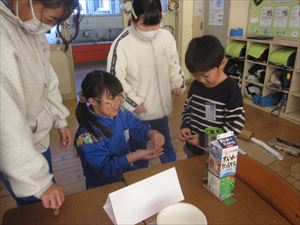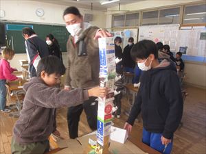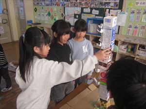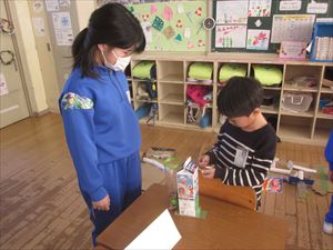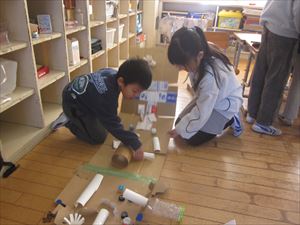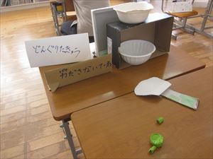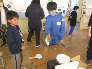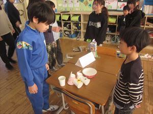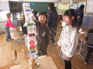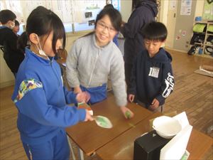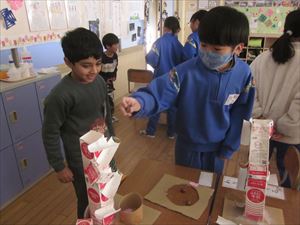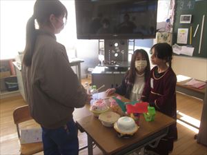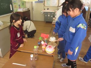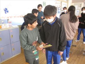 12月12日(金)の2校時、1・2年生の生活科でおもちゃまつりが開催されました。どんぐりや牛乳パック等を材料に、趣向を凝らしたおもちゃを作ってくれた1・2年生。上の学年のお兄さんお姉さんをお客さんとして招き、作ったおもちゃを宣伝しながら一緒に楽しく遊ぶことができました。教室中に響く歓声や、「いらっしゃいませー!」の呼びかけがとても微笑ましかったです。自分たちが作ったおもちゃで、たくさんの人を楽しませることができ、1・2年生もとても嬉しそうでした。