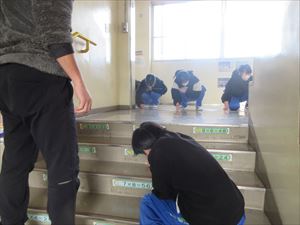 みんなでスポンジをもって、廊下や階段の汚れ落としを行いました。