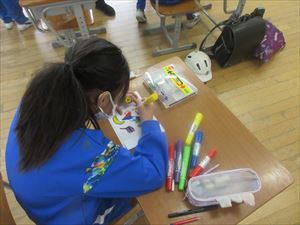 もう一つは「オールマイティークラブ」です。宝探しやバドミントン、調理実習など、スポーツにこだわらず、いろいろな活動をするクラブです。今日はプラバンづくりで、自分で描いたイラストにカラーペンで色付けをしているところでした。見学した3年生も興味深く見学していました。