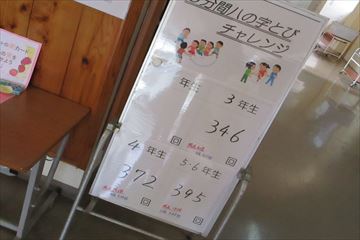 大縄で行う「8の字とび」は、「いばらきスポーツチャレンジ」に登録しています。昇降口のホワイトボードにも、校内の結果が記録されています。学校の中だけでなく、県内の同学年の子どもたちとも記録を競い合えて、子どもたちはなわとびを通して、お互いに高め合う喜びを味わっています。