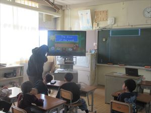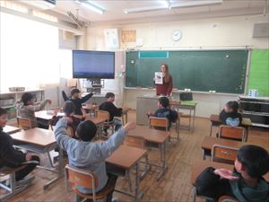 カードに書かれたイラストをもとに話したり、英語の歌をみんなで歌ったり、とっても元気な1・2年生でした。