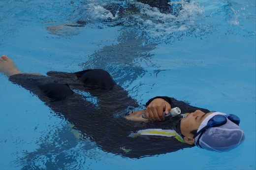 5・6年生が命を守る学習をしました。ジャージを着用して水に入り、水着だけ時との違いを体感しました。また、ペットボトルを使って体を浮かせる練習もしました。