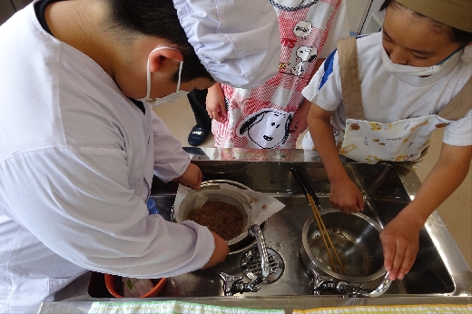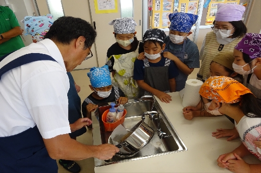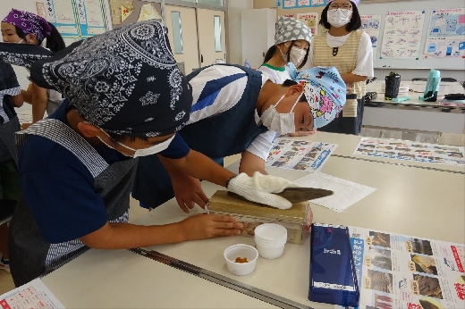 5年生が「にんべん」の出前授業を行いました。鰹節について学習し、実際に削って出汁をとり、味噌汁を作りました。最後に出汁で作った味噌汁と出汁の入っていない味噌汁の飲み比べをしましたが、全員、味を見分けることができました。家庭科の調理実習では、煮干しの出汁で味噌汁を作るので、その味比べもできそうです。