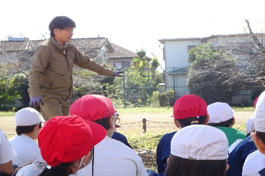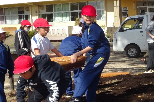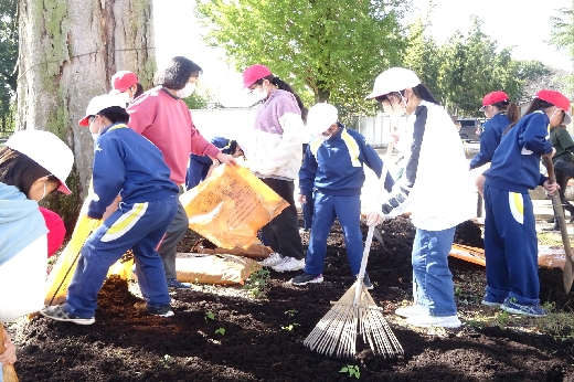 3・4時間目に樹木医の古谷先生に来ていただいて、4~6年生が「けやき再生プロジェクト」を行いました。樹についての学習をした後、シンボルツリーのけやきの根元に肥料50袋を敷き詰めました。弱ったけやきの栄養になるそうです。JRCの活動実践として行ったので、JRC賛助奉仕団の方2名も弓馬田っ子たちの活動の様子を見守ってくださいました。