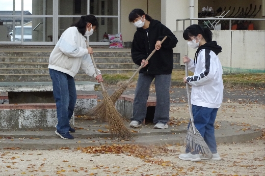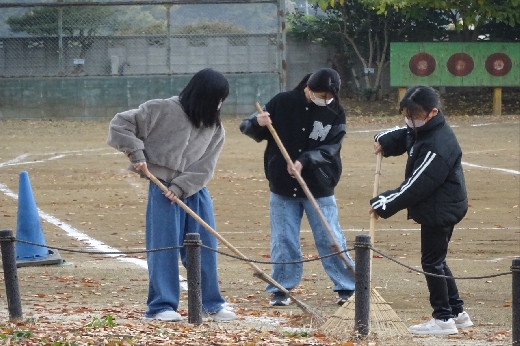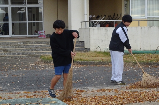けやきの葉が落ち始めて、今年も落ち葉はきの季節になりました。今日から、毎朝、学年ごとに落ち葉はきをします。今日は6年生でした。これまで5年間毎年やってきたので、とても手際よく作業を進めていました。
