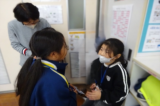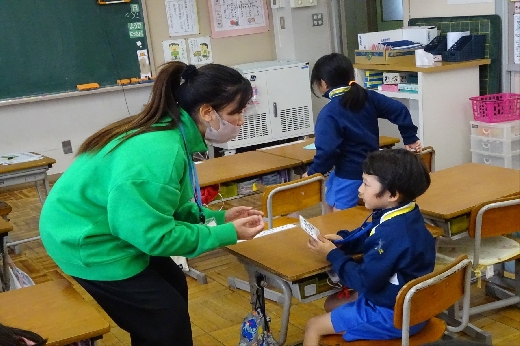 5時間目、1年生は英語の時間でした。ALTの先生と一緒に「好きな野菜はなんですか?」と英語で質問して、答える学習をしました。