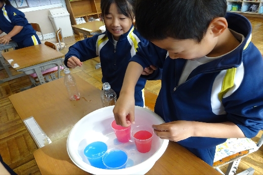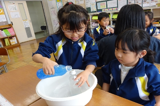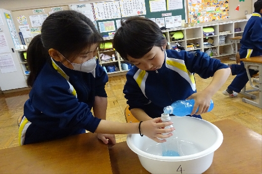 2時間目、1年生は算数の学習でした。形の違う2本のペットボトルで、どちらがより多くの水が入るかを調べる方法を考えていました。ペアでアイデアがまとまったら、実際に色水を使って確かめていました。