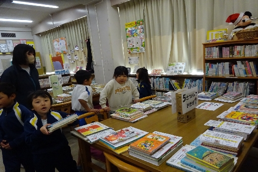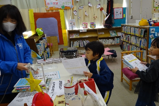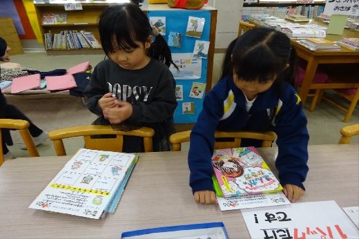 今日から、冬休みに読む本の貸し出しが始まりました。1人、5~10冊借りられます。今回は、先生方が選んだ2種類のおすすめパックもあります。3時間目に1年生が本を選んで借りました。おすすめパックを選んだ後、残りの本を本棚から選びます。パックを選ばないで、全部自分で選ぶこともできます。いろいろな本に出会って、楽しい時間を過ごしてくれればと思います。