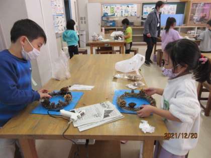 12月20日(月)に1年生が生活科でみつけた烏瓜のつるなどを活用してクリスマスリースを作りました。お家から用意してきたリボンや葉っぱ、どんぐり、わた、ドライフラワーなどや学校で用意した木の実、松ぼっくりなどを使って、オリジナルのツリーを完成させました。どの子も大満足のようです。作品を持ち帰りましたら、ぜひお家に飾ってください。